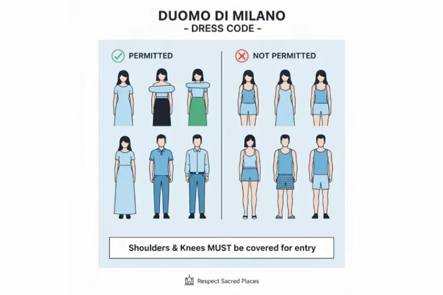 The dress code at Duomo Milan is a strict entry requirement mandating that all visitors cover their shoulders and knees while inside the cathedral. Security personnel enforce these regulations by denying access to individuals wearing sleeveless tops, short shorts, mini-skirts, or hats. Compliance is compulsory for men, women, and children to ensure admission.