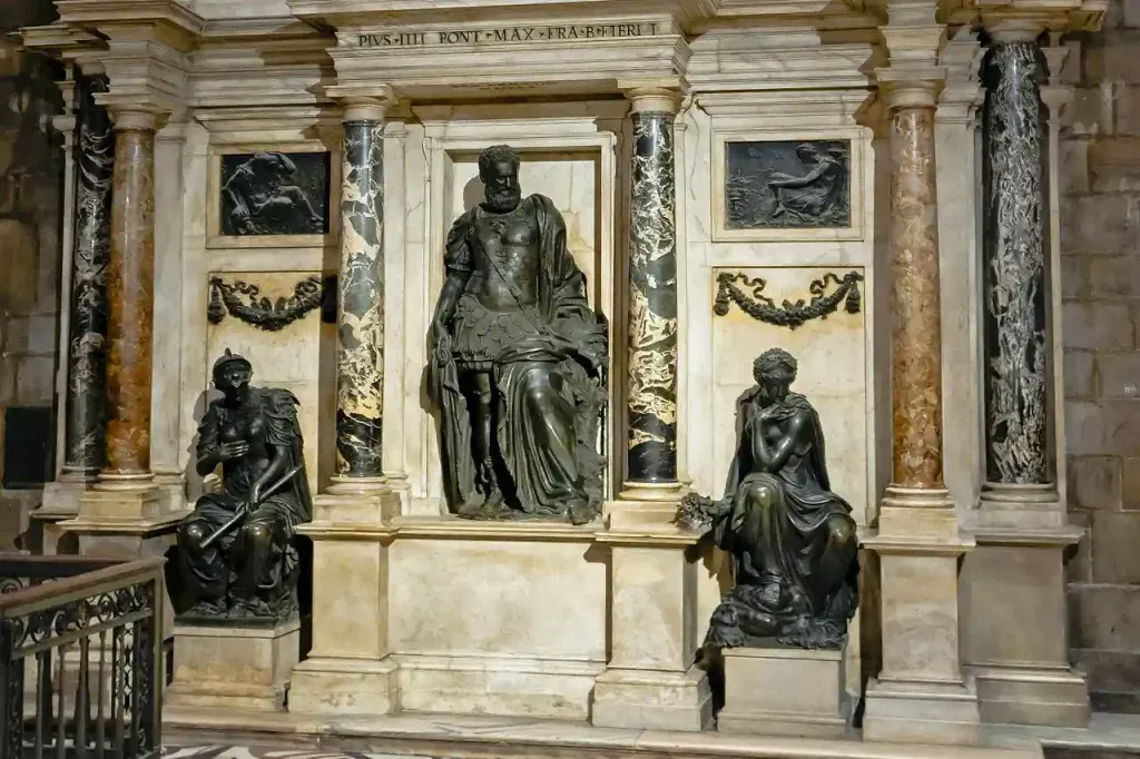 The cathedral houses several funerary monuments of figures with great historical relevance. For example, the tomb of Gian Giacomo Medici sits inside the Duomo of Milan, who served as a soldier and commanded the imperial troops during the 16th century. Leone Leoni constructed this marble tomb between 1560 and 1563.
